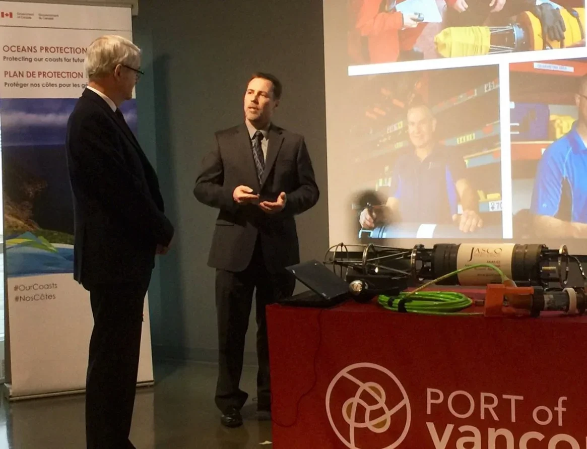 Transportation Minister Marc Garneau (left) and David Hannay, JASCO's Chief Science Officer (right).